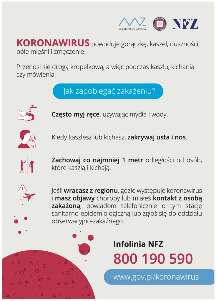 Zgodnie z decyzją rządu z dnia 11.03.2020 r. zajęcia dydaktyczno-wychowawcze w przedszkolach oraz w innych placówkach oświatowych (w tym niepublicznych) z powodu zagrożenia koronawirusem zostają zawieszone do dnia 25.03.2020 r. włącznie.